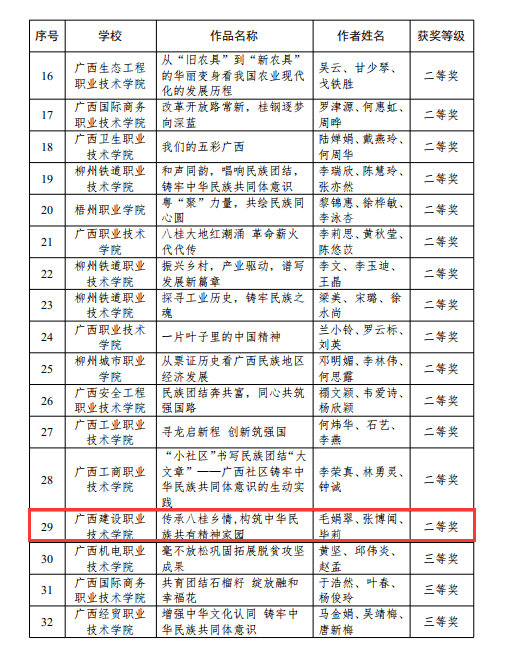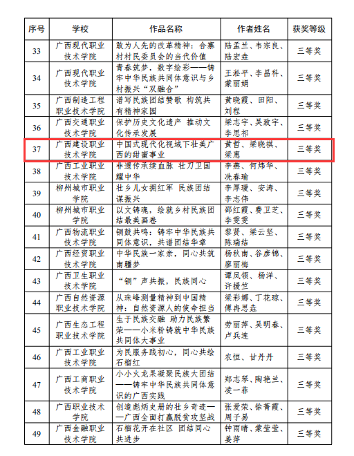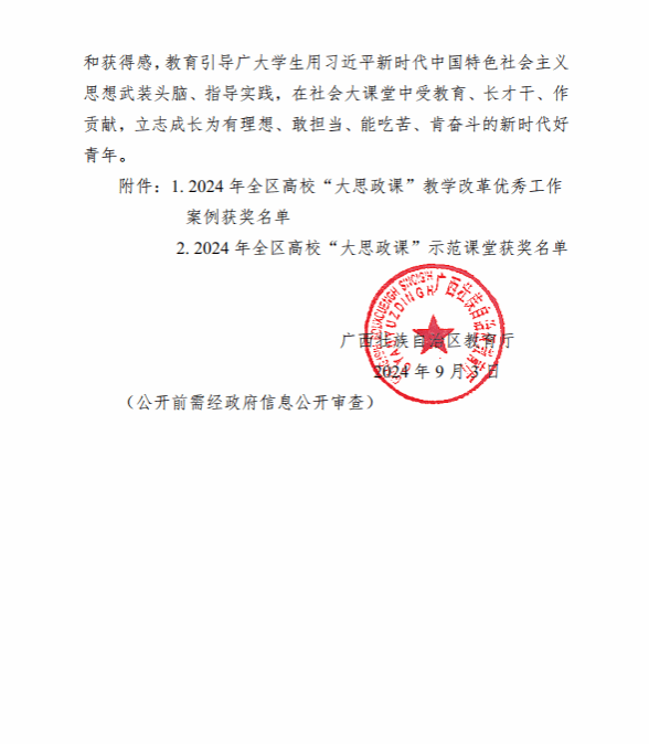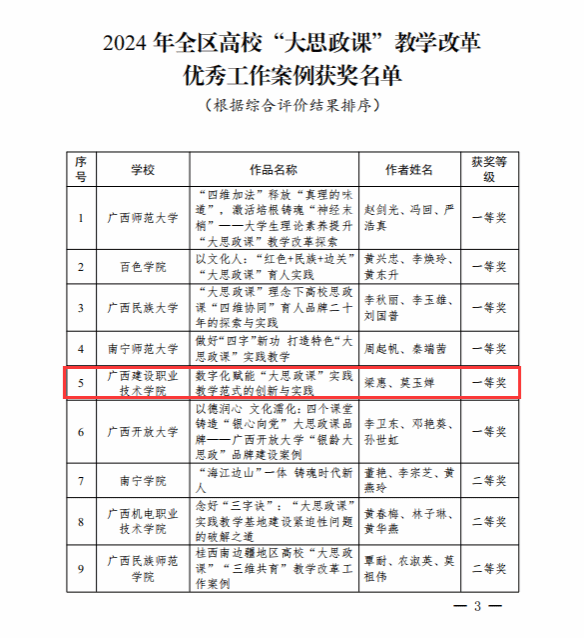 广西建院9月6日讯(马克思主义学院 宋佳雄)近日,自治区教育厅公布了2024年全区高校“大思政课”教学改革优秀工作案例和示范课堂征集活动获奖名单。乐鱼全球最大体育平台_乐鱼(中国)马克思主义学院教师梁惠、莫玉婵的作品《数字化赋能“大思政课”实践教学范式的创新与实践》荣获“优秀工作案例”一等奖,毛娟翠、张博闻、毕莉的作品《传承八桂乡情,构筑中华民族共有精神家园》荣获高职高专组“示范课堂”二等奖,黄哲、梁晓祺、梁惠的作品《中国式现代化视域下壮美广西的甜蜜事业》及江紫凤、谭臻、刘荔源的作品《“三坚持”走好群众路线 各民族共铸“石榴情深”》分别荣获高职高专组“示范课堂”三等奖。