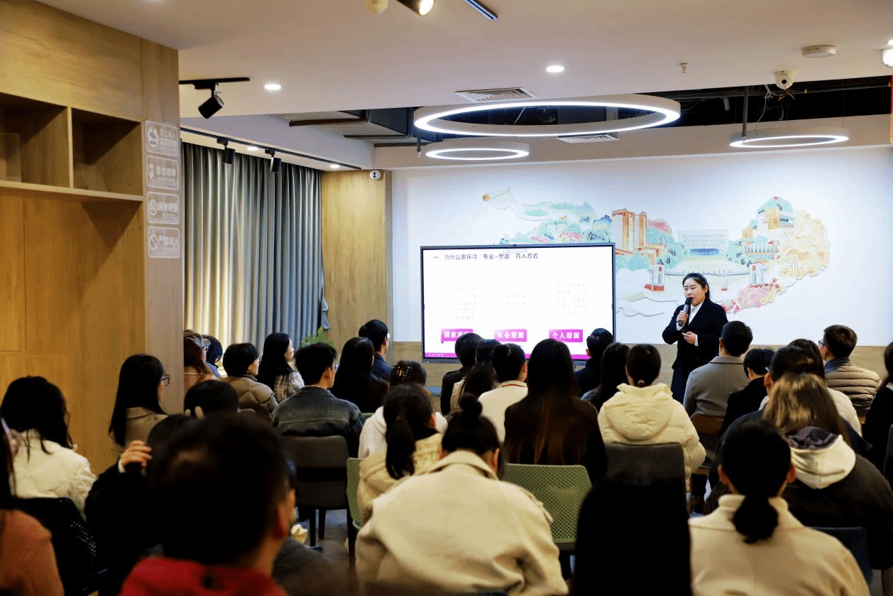 专题分享环节,班宁老师从个人对辅导员发展路径、职业归属感、职业信念感的思考出发,结合自己参加国家级、自治区多项赛事,建设“课栈有约”辅导员工作室的经验体会,以及日常学生工作案例,为在场老师深刻、生动地阐释了“专业+思政”育人的意义、内涵和方式,鼓励大家融合学生学科专业元素,发挥辅导员个人特长专长,在日常学生思政工作、思政课教学能力提升、学生党团组织建设中,去探寻“专业+思政”育人最优解,以赛促学向辅导员专业化、职业化、专家化方向奋进。