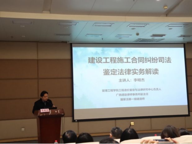 本次公益讲座邀请了广西盛元华工程咨询有限公司副总经理兼法鉴定中心主任陆冬、管理工程学院工程造价鉴定与法律研究中心负责人李明杰进行授课。他们分别围绕“建设工程造价司法鉴定相关规定及案例分析”“建设工程施工合同纠纷司法鉴定法律实务解读”专题进行讲解,通过大量案例,深入浅出地把理论知识和实践应用融为一体,学员们深受启发。