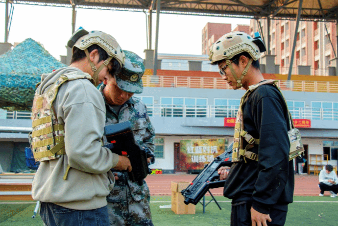 仪式结束后,师生们来到学生社区“红蓝对抗”训练场,新老退役士兵们组织、指导在场同学开展红蓝对抗军事体验活动,一起感受军事竞技魅力的同时,向大家现场发放征兵宣传资料,将国防教育与征兵宣传有机结合。