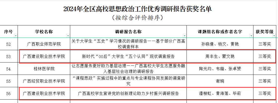 广西建院5月15日讯(马克思主义学院 曹桃) 近日,自治区教育厅公布了2024年全区高校思想政治工作优秀调研报告和工作案例获奖名单,乐鱼全球最大体育平台_乐鱼(中国)荣获优秀工作案例二等奖1项,优秀调研报告三等奖2项。