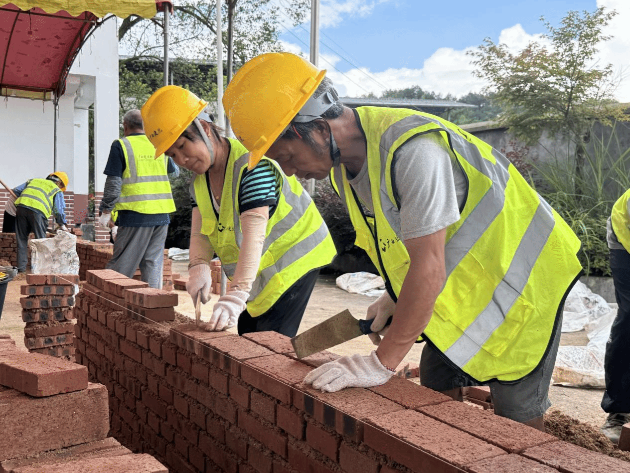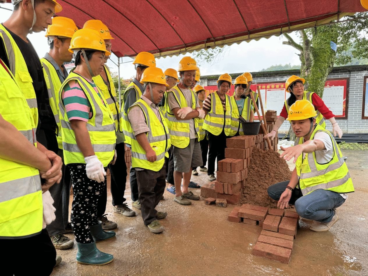 在砌筑实操现场,学员们神情专注,挑砖、找平、测量、切割、铺浆、砌筑、勾缝……砖刀和测量尺在村民手中不停地翻转、挥动,砖墙的造型显现出雏形。“真没想到短短的几天内学到这么多砌筑的规范知识,感谢政府和学校把技能送到了家门口。”桂林市资源县马家村村民马代维看着自己小组砌好的砖墙开心地说。