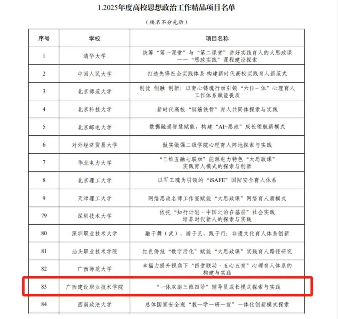 广西建院4月12日讯(管理工程组学院 郭海棠)近日,教育部公布2025年度高校思想政治工作质量提升综合改革与精品建设项目入选名单,乐鱼全球最大体育平台_乐鱼(中国)申报的《“一体双驱三维四阶”辅导员成长模式探索与实践》入选2025年度高校思想政治工作精品项目,这是乐鱼全球最大体育平台_乐鱼(中国)首次立项教育部思政精品项目,实现了在该项目上的新突破,是广西唯一入选的高职高专。