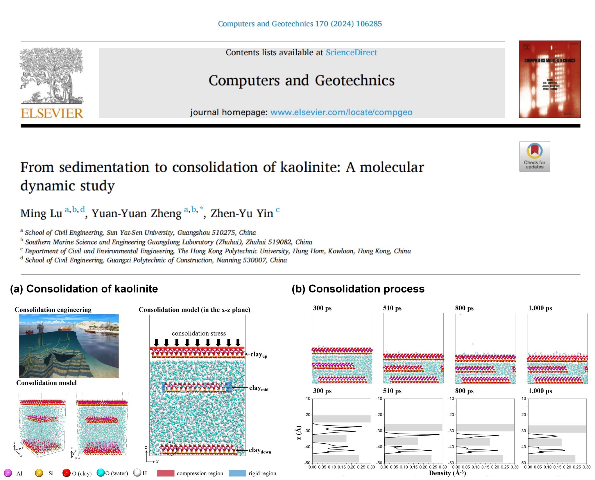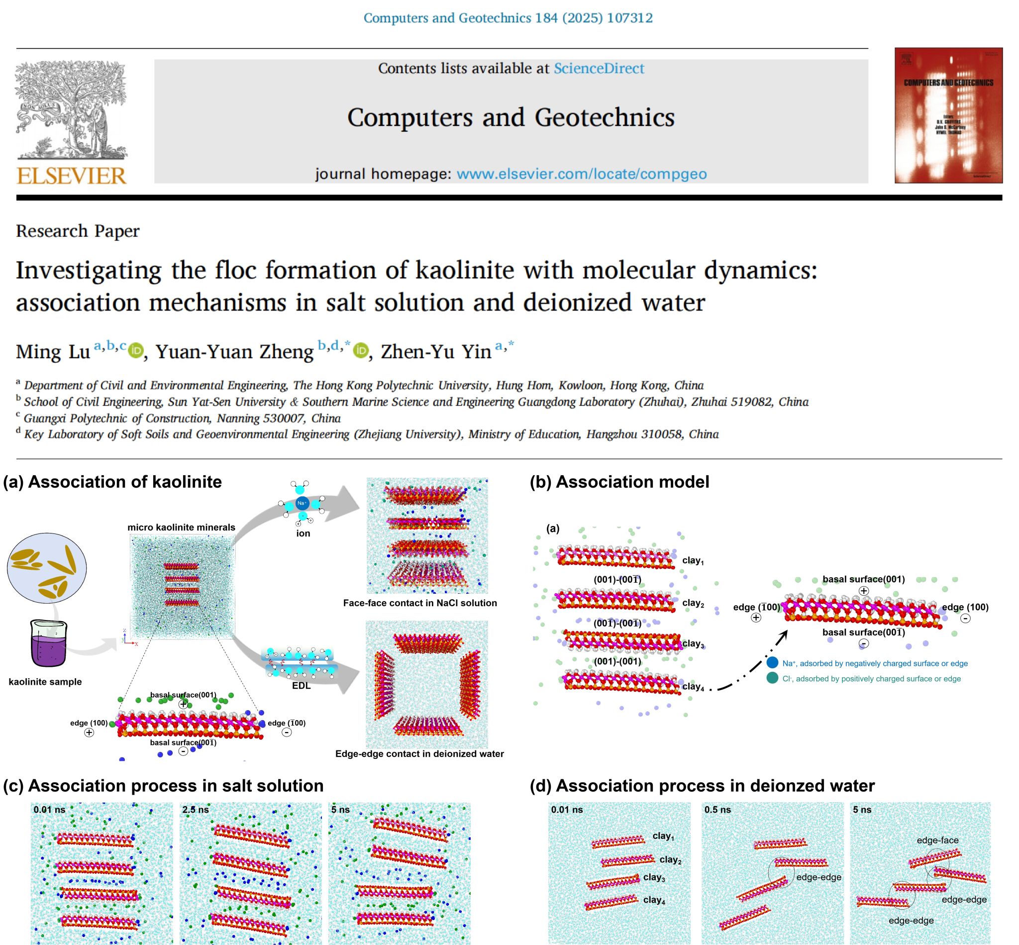 此外,有效应力原理衍生出的固结、沉淀理论同样是土力学的热点、难点。陆明博士与中山大学、香港理工大学团队再度合作,运用分子动力学方法复现了黏土矿物在固结、沉淀过程中的排水压缩行为(图2)和缔合联结(图3)现象,揭开了黏土矿物在微观物理世界的神秘面纱,两项成果均发表在中科院一区Top期刊《Computers and Geotechnics》上,是乐鱼全球最大体育平台_乐鱼(中国)与国际知名高校团队在纳米土力学领域上合作的又一重要突破。
