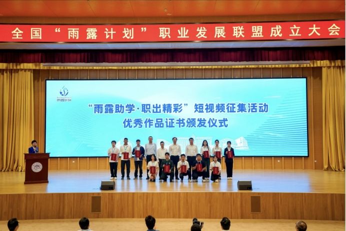 与会领导为“雨露助学 职出精彩”短视频征集活动中的11部优秀作品颁发证书(卢健勇同学位列一排左二)