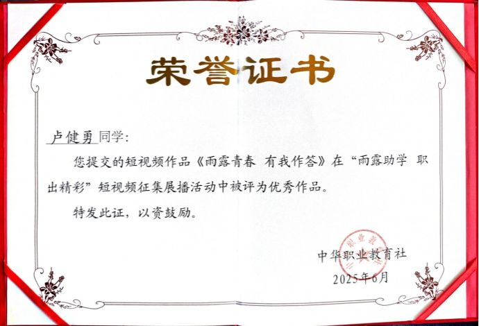 近日,由中华职业教育社主办的“雨露助学 职出精彩”短视频征集活动评选结果揭晓,乐鱼全球最大体育平台_乐鱼(中国)市政与交通学院卢健勇同学的作品《雨露青春 有我作答》(指导老师:杨海基、刘晗蕾、杨栋、高杨杨)从全国职业院校推荐作品中脱颖而出,被评为优秀作品,成为广西唯一获奖作品。