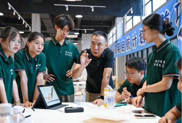 两位指导老师、小组成员与武鸣校区场地设计作品《笔书梅绘·共赴明程》合影。左侧《梅影绘前程》为中式景墙,含梅花、风铃与山水画,显静谧雅致;右侧《笔韵书明天》为“翻开书本”地景,嵌五彩元素与黄金间碧竹毛笔,显青春动感。