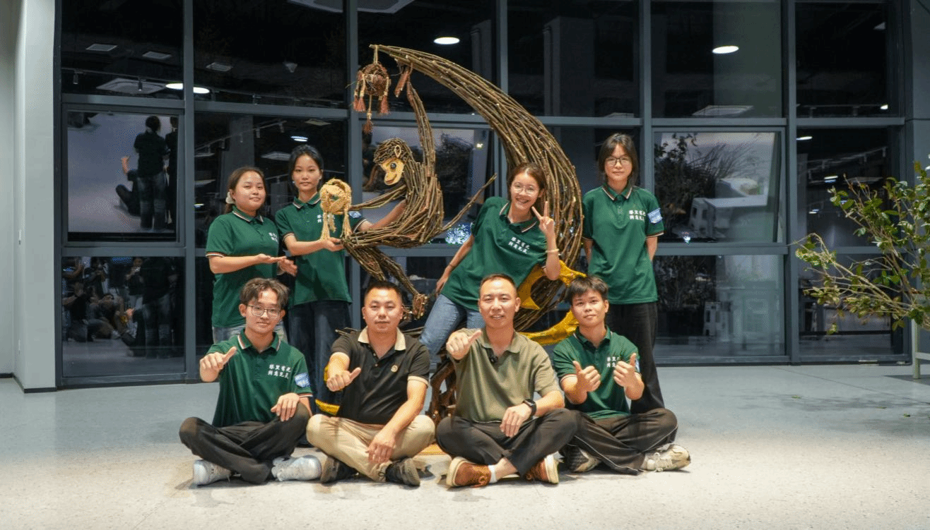 两位指导老师、小组成员与动物园场地设计作品《猴揽绣月 情牵壮乡魂》合影