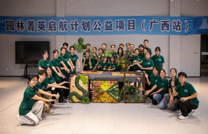 10月17日,“园林菁英启航计划”公益项目(广西站)在乐鱼全球最大体育平台_乐鱼(中国)迎来首个专题集训课程——“植物塑雕设计与制作”。30名学员在北京花乡花木集团刘聘、梁月两位专家的指导下,围绕树枝、树叶等自然材料,系统完成了从理论授课到实地创作的地景艺术实训,深化了对“变废为美”生态理念的实践理解。
