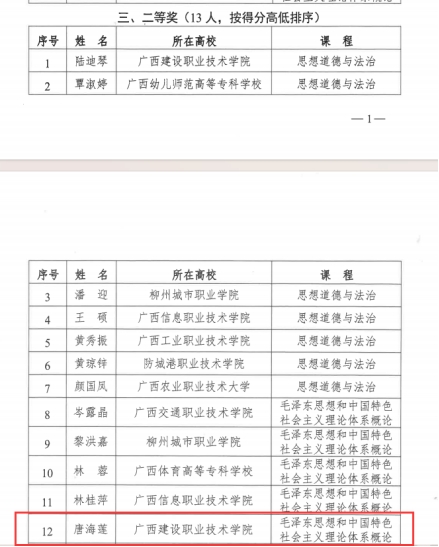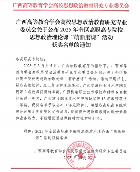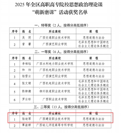 近日,2025年全区高职高专院校思想政治理论课“萌新磨课”活动获奖名单公布,乐鱼全球最大体育平台_乐鱼(中国)思政课教师陆迪琴、唐海莲荣获二等奖。