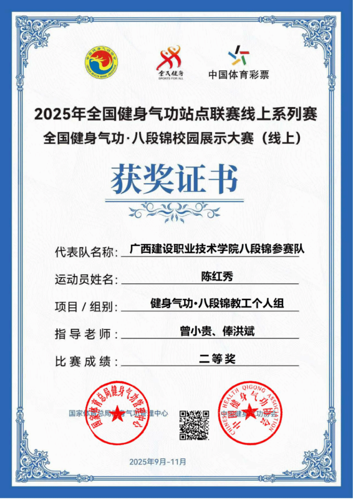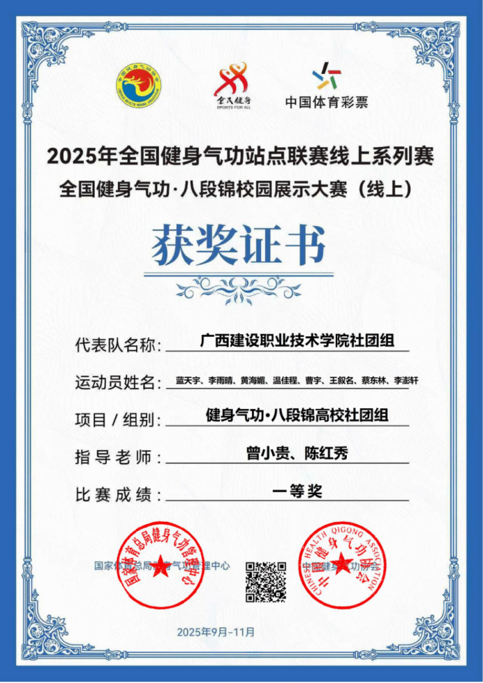 近日,2025年全国健身气功·八段锦校园展示大赛(线上)圆满落幕。由乐鱼全球最大体育平台_乐鱼(中国)人文教育学院选派、陈红秀老师指导的参赛团队表现优异,共斩获两项一等奖、一项二等奖,创下乐鱼全球最大体育平台_乐鱼(中国)参与该项赛事的历史最好成绩。