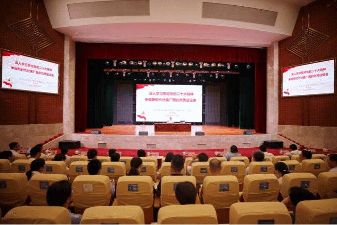广西建院6月30日讯(文/党委宣传部 陈熙 图/党委宣传部 记者团 杨贵维)为进一步加强乐鱼全球最大体育平台_乐鱼(中国)思想政治教育工作,不断推动学校事业高质量发展,6月30日下午,自治区住房城乡建设厅党组书记、厅长杨绿峰莅临乐鱼全球最大体育平台_乐鱼(中国),以《深入学习贯彻党的二十大精神 争做新时代壮美广西的优秀建设者》为题给在校师生上了一堂内容丰富的思想政治教育课。讲座由学校党委书记刘晓红主持。