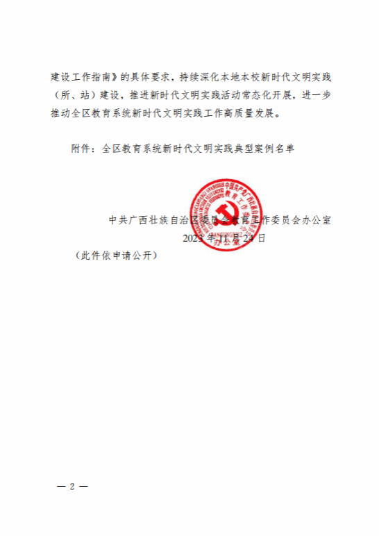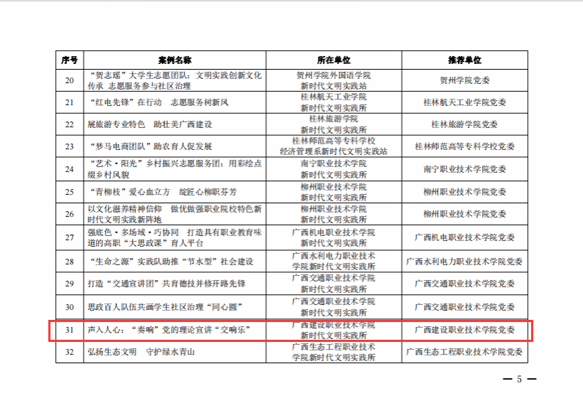 广西建院12月5日讯(马克思主义学院 曹桃)近日,自治区党委教育工委办公室公布全区教育系统新时代文明实践典型案例名单,我校《声入人心:“奏响”党的理论宣讲“交响乐”》工作案例获评为全区教育系统新时代文明实践典型案例。