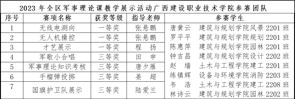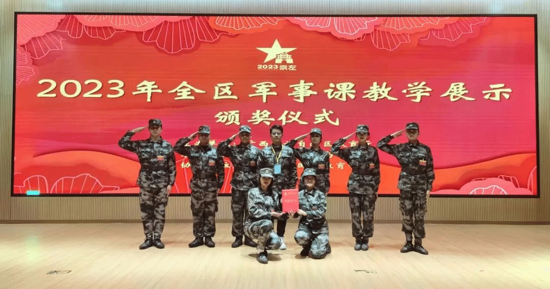 广西建院12月25日讯(党委学生工作部 张悬鹏)12月17日至22日,由自治区教育厅主办、桂林理工大学南宁分校承办、广西高校国防教育学会协办的2023年全区军事课教学展示活动在广西崇左落下帷幕,共有来自全区23支代表队参加。活动围绕《军歌小合唱》《电磁频谱管控—无线电测向》《军事理论知识考核》《无人机操控》《手榴弹投掷》《国旗护卫队展示》《才艺展示》等7项军事课,开展现场展示和竞技比赛。