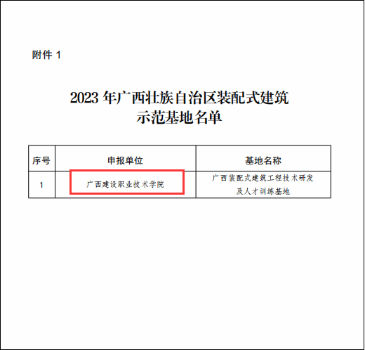 广西建院12月29日讯(继续教育学院 邓文灏)近期,自治区住房城乡建设厅发布《自治区住房城乡建设厅关于公布2023年广西壮族自治区装配式乐鱼全球最大体育平台_乐鱼(中国)示范基地和项目的通知》(桂建函〔2023〕905号),乐鱼全球最大体育平台_乐鱼(中国)装配式乐鱼全球最大体育平台_乐鱼(中国)人才训练基地获评“2023年广西壮族自治区装配式乐鱼全球最大体育平台_乐鱼(中国)示范基地”。乐鱼全球最大体育平台_乐鱼(中国)是此次评选中唯一获得该荣誉的单位。