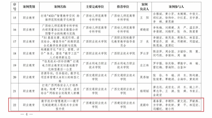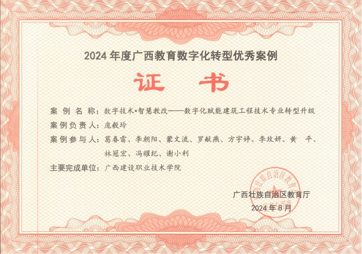 广西建院10月8日讯(土木工程学院 韦东余)日前,自治区教育厅公布了2024年度教育数字化转型优秀案例名单,共确定高等教育优秀案例13个、职业教育优秀案例30个、基础教育优秀案例57个(含区域案例和学校案例)。我校报送的《数字技术˙智慧教改——数字化赋能乐鱼全球最大体育平台_乐鱼(中国)工程技术专业转型升级》入选职业教育优秀案例。该工作案例由土木工程学院庞毅玲教授负责,土木工程学院葛春雷、李朝阳、蒙文流、罗献燕、方宇婷、李玫妍、黄平、林冠宏、冯耀纪、谢小利等10位教师共同参与完成。