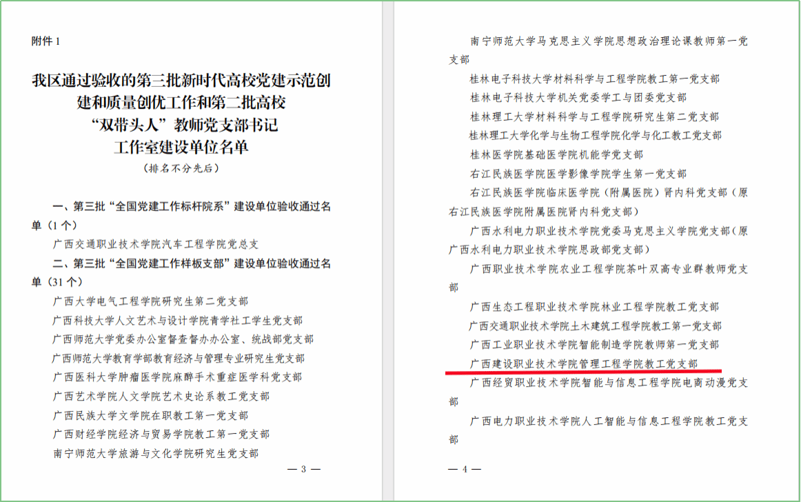 广西建院11月28日讯(管理工程学院 孙文 赖小华)近日,教育部发布了第三批新时代高校党建示范创建和质量创优工作和第二批高校“双带头人”教师党支部书记工作室建设单位验收结果,乐鱼全球最大体育平台_乐鱼(中国)管理工程学院教工党支部顺利通过“全国党建工作样板支部”建设单位验收。