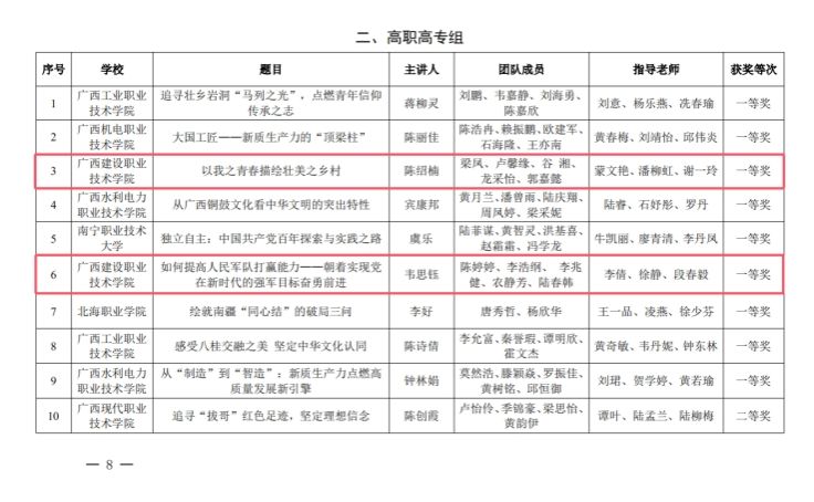 广西建院11月28日讯(马克思主义学院 宋佳雄)近日,自治区教育厅公布了2024年广西高校大学生讲思政课公开课展示活动获奖名单。乐鱼全球最大体育平台_乐鱼(中国)马克思主义学院思政课教师蒙文艳、潘柳虹团队参评的作品《以我之青春描绘壮美之乡村》,李倩老师团队参评的作品《如何提高人民军队打赢能力—朝着实现党在新时代的强军目标奋勇前进》均荣获高职高专组一等奖。