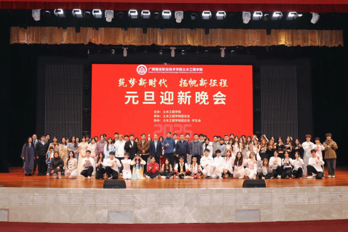 广西建院12月29日讯(土木工程学院 文/石明成 苏艳玲 图/赵子丞 黄明烨 张伟)近日,土木工程学院在学校礼堂举行了“筑梦新时代,扬帆新征程”2025年元旦迎新晚会。学院党总支书记孔祥刚副院长谢华、葛春雷团总支书记冯光帆,全体学管干事、辅导员及2024级新生参加晚会。