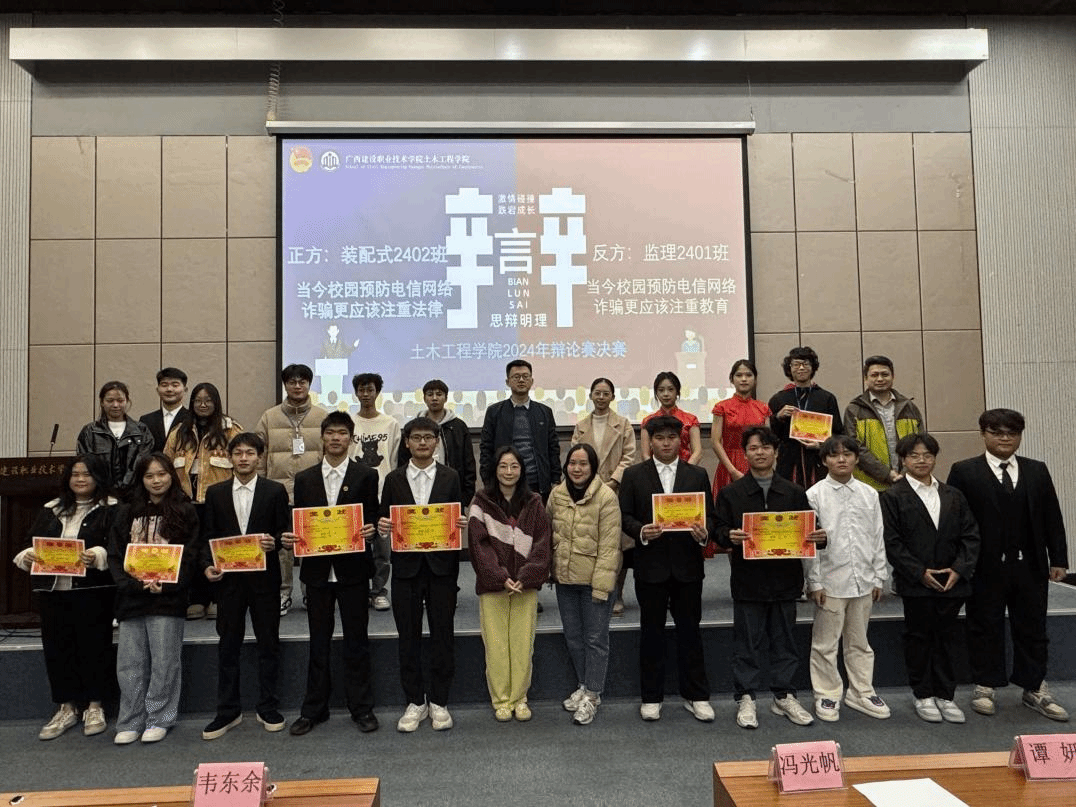 广西建院12月31日讯(土木工程学院 文/石明成 谭妍 图/吴海平 梁建新 张春毅)12月30日,土木工程学院在6教3楼会议室举行2024年辩论赛决赛。此次活动聚焦“提升电信网络诈骗防范意识”主题,深入探讨法律与教育在预防校园诈骗中的核心作用。学院团总支书记冯光帆,辅导员代表,学生代表共158人参加活动。
