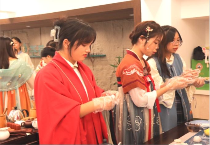 茶艺基地充分发挥重要时间节点的心理育人功能,在传统节日开展“我们的节日”特色活动,增强学生的认同感和自豪感,铸牢中华民族共同体意识。在广西“三月三”,通过赶歌圩、传绣球、打扁担、尝五色糯米、制艾叶糍粑场景体验,加深了同学们对壮族文化的了解和认同,同时增进了解和信任,建立紧密和谐的人际关系;在中秋节,师生们围桌而坐,赏明月、品月饼,弘扬和谐、团圆、互敬的价值观念,增强情感联结与归属感、满足心理需求,缓解压力;在每一个节气,开展“梦想朗读者”专题诵读,推出“《梦想朗读者》之二十四节气”系列48期,用真挚动人的朗诵,提醒师生顺应天时、敬畏自然、提升生活品质与审美情趣。