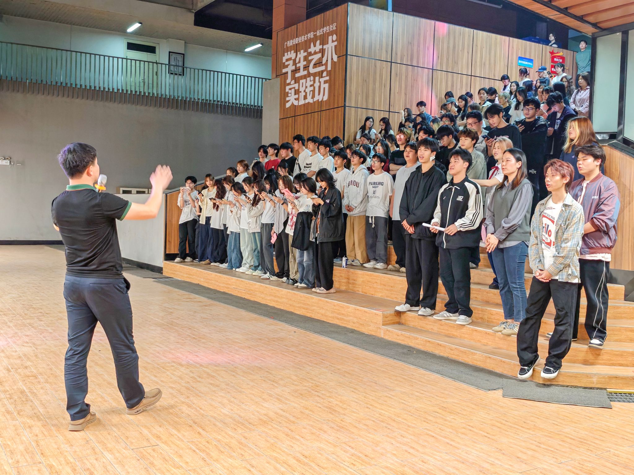 广西建院3月27日讯(艺术设计学院 文/谢安妮 黄皓斌 图/黄海文)3月24日晚,一场别开生面的学雷锋活动在大学生艺术实践坊进行,艺术设计学院团总支组织青年学子以“传承雷锋精神 争做时代新人”为主题,用“学习、分享、传唱、践行”的形式,通过沉浸式学习、故事分享、歌曲重温、志愿服务,让雷锋精神在艺术实践中焕发新活力。