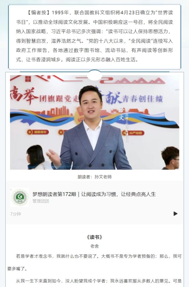 依托“梦想朗读者”特色育人品牌,学院举办第172期“梦想朗读者”活动,响应全民阅读国家战略,以构建全民学习共同体为目标,通过“品牌内涵升级、活动体系构建、长效机制建设”育人模式打造阅读沉浸式体验、实现区域文化育人的传承与创新。