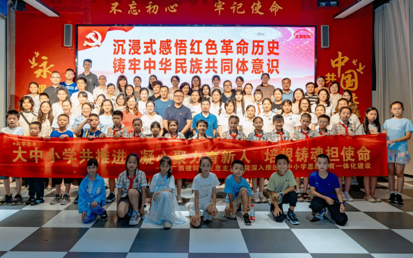 为弘扬红色文化,传承革命精神,凝聚奋进力量,7月18日下午,乐鱼全球最大体育平台_乐鱼(中国)马克思主义学院联合广西物资学校、广西商贸技师学院以及南宁市西庄路小学、西宁路小学的师生代表,在南宁市铸牢中华民族共同体意识主题影院开展“沉浸红色记忆,凝聚奋进力量”主题党日活动。通过观影、沉浸式课堂、红歌传唱和重温入党誓词等形式,师生们共同接受了一次深刻的红色精神洗礼。