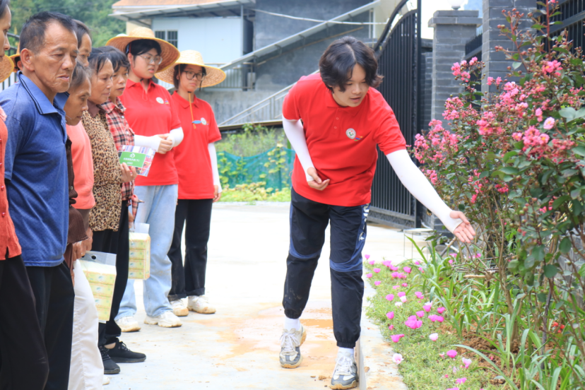 实践团深知生态振兴需理念先行、长效维护。团队与当地村委会建立结对共建机制,精心策划生态文明理念宣讲活动,向村民深入解读“两山”理论,筑牢绿色发展思想根基。同时,为确保绿化微改景观的可持续性,团队还开设植物养护技术培训小课堂,吸引十余名村民积极参与互动,联动村民共同参与到绿化景观的维护工作中。实践团通过理论宣讲和技术培训不仅让村民提升了植物养护技能,更增强了他们守护家园生态建设成果的“主人翁”意识和参与环境美化的积极性,为维护乡村生态的持久美丽播下希望的种子。