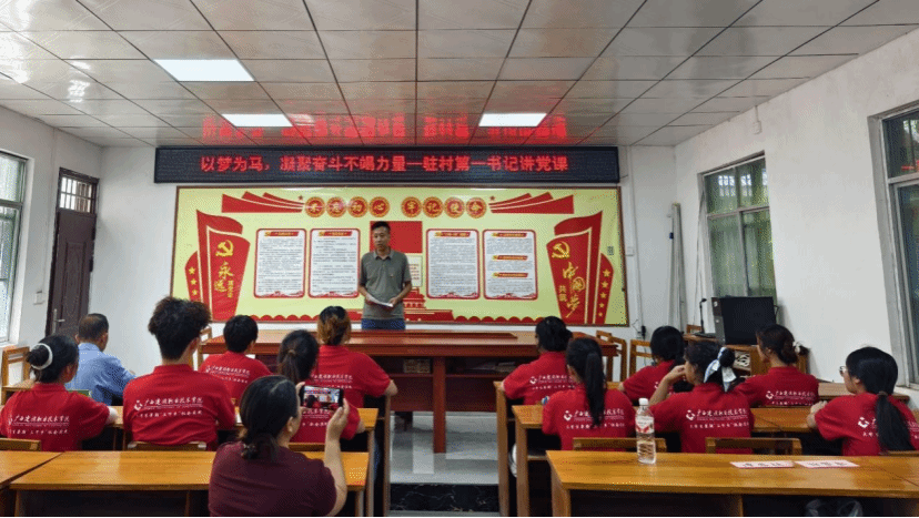 实践团与万茂村党总支开展结对共建,聆听“双料书记”宋佳雄的动人故事。当听说万茂村驻村第一书记宋佳雄是广西建院马克思主义学院的专任教师,且今年是他第二次驻村担任第一书记时,实践团的同学们对宋书记与万茂村的故事都特别期待。活动期间,实践团师生请宋书记为学生们上党课。宋佳雄书记详细介绍了万茂村近十年来在广西建院的大力帮扶下,经济建设、生态文明建设等方面取得的成绩,帮助师生全面了解村情村貌。