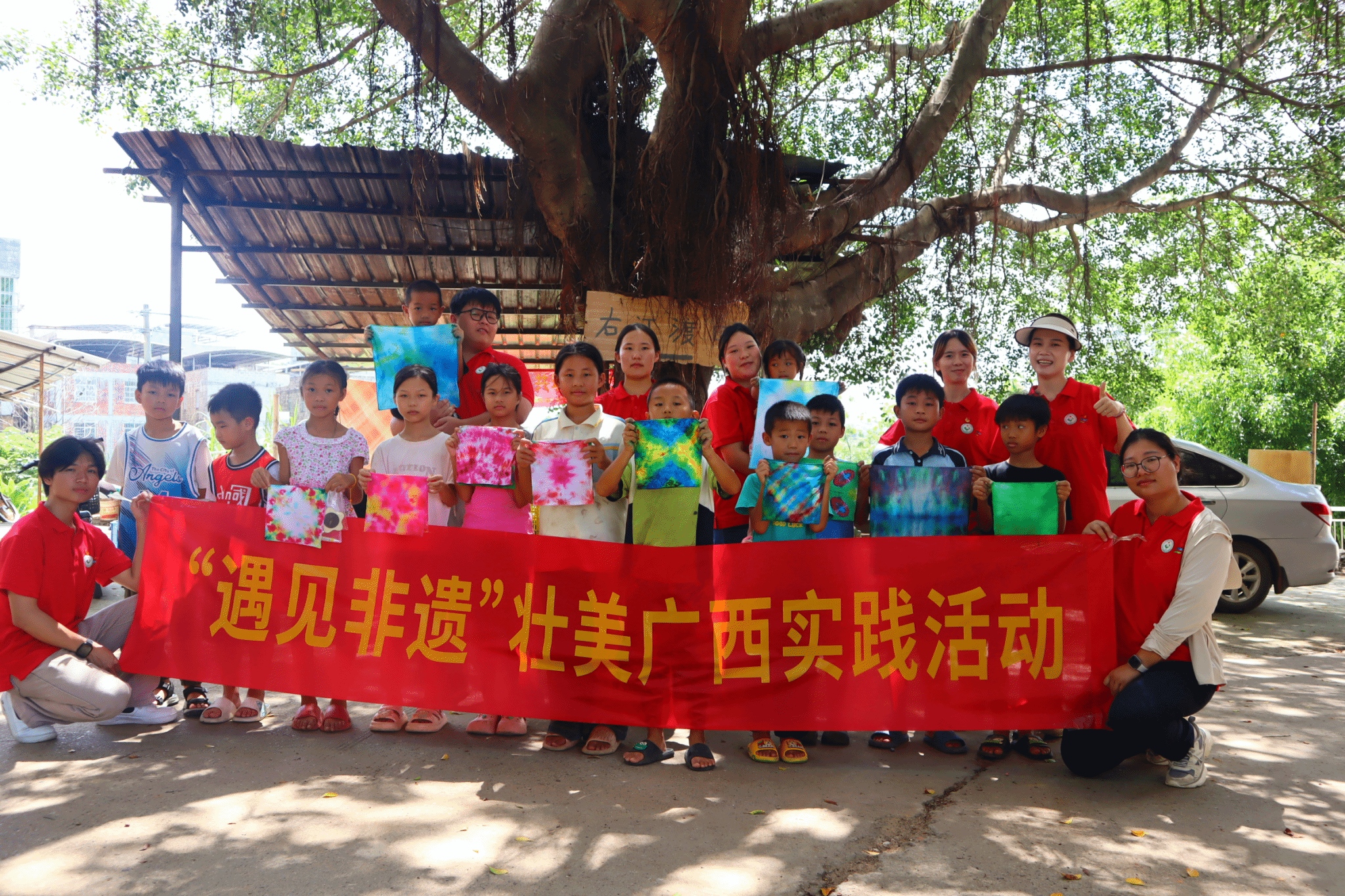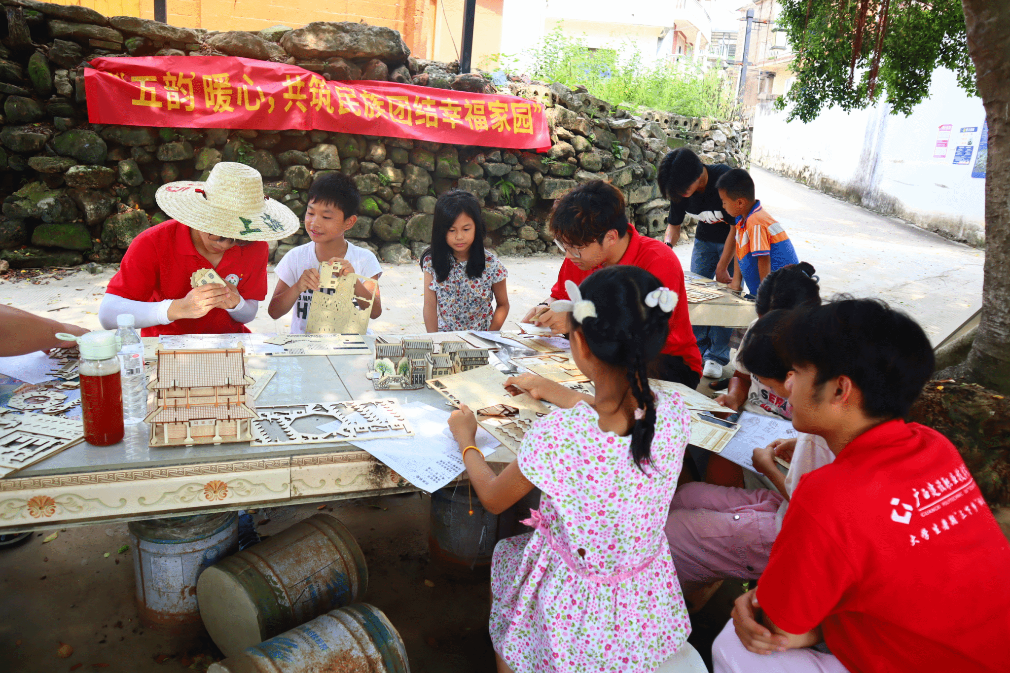 实践团以“非遗+趣味”为特色,为当地儿童开设系列文化体验课程。在榫卯乐鱼全球最大体育平台_乐鱼(中国)手工搭建活动中,孩子们通过组装构件感受传统乐鱼全球最大体育平台_乐鱼(中国)的精妙;非遗扎染课堂上,蓝白相间的图案展现了传统工艺的魅力;铜鼓模型制作环节,孩子们精心绘制壮锦纹理,体验民族文化精髓;“我心中的三江坡”主题绘画课则让孩子们用画笔表达对家乡的热爱。