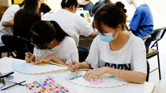 角夏至入头九,羽扇握在手”。夏至时节,古代女子有互赠折扇习俗,“扇”在汉字中,与“善”同音,因此互赠折扇既有消夏避暑之用,也有传递善意之意。为增加节气之美的体验,活动最后,师生以折扇为纸,用马克笔、水彩颜料手绘荷花。栩栩如生的荷花,呈现在扇面上,纳凉解暑、清风徐来。