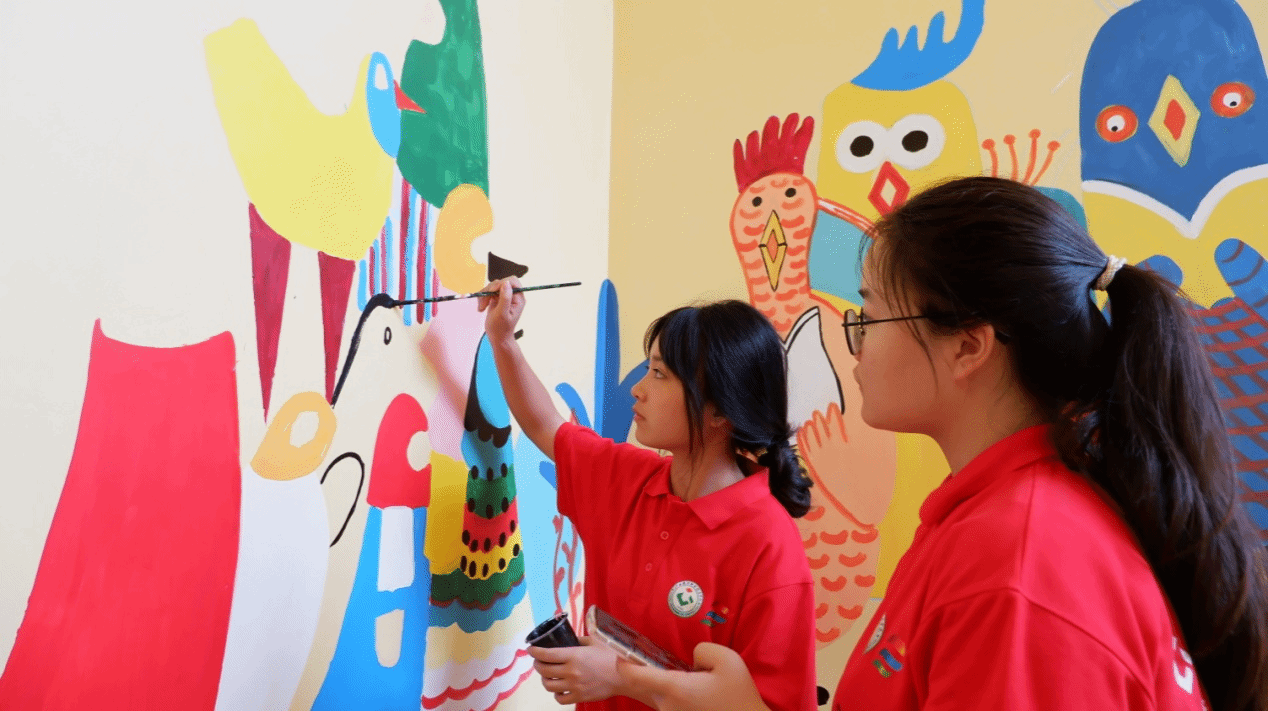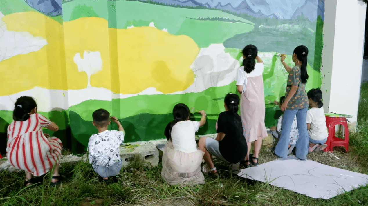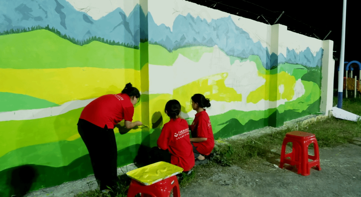 经过连日的努力,实践团圆满完成了河池市南丹县六寨社区党群服务中心外面约60平米的墙画绘制。同时,实践团还应当地苗苗幼儿园的需求,为幼儿园楼梯墙面等绘制了充满童趣的卡通形象墙,为幼儿园开展美育教育营造了良好的氛围。