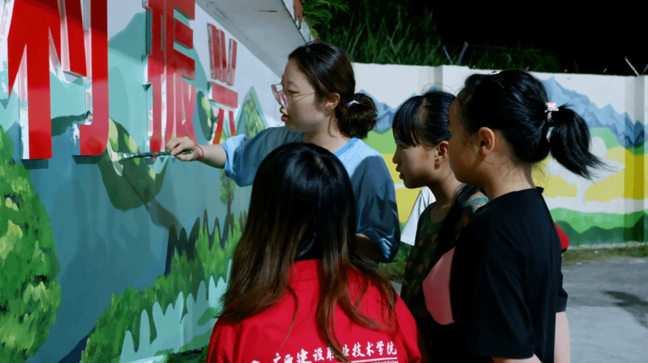 近年来,广西建院“绘美乡村”实践团多次赴乡村开展墙画绘制,先后创作了《实施乡村振兴战略》《美在乡村》《党建引领绘蓝图》《乡村振兴谋发展》等巨幅作品,发挥师生手绘专业优势,引领乡风文明新风尚,助力乡村文化振兴。本次实践团保留墙面原有的“抓党建 促乡村振兴”宣传标语,以六寨镇青山绿树生态优势为创作元素,突出“强党建引领,建美丽乡村”主题内容进行绘制,在美化六寨社区党群服务中心的同时,引导群众牢固树立“绿水青山就是金山银山”的理念。