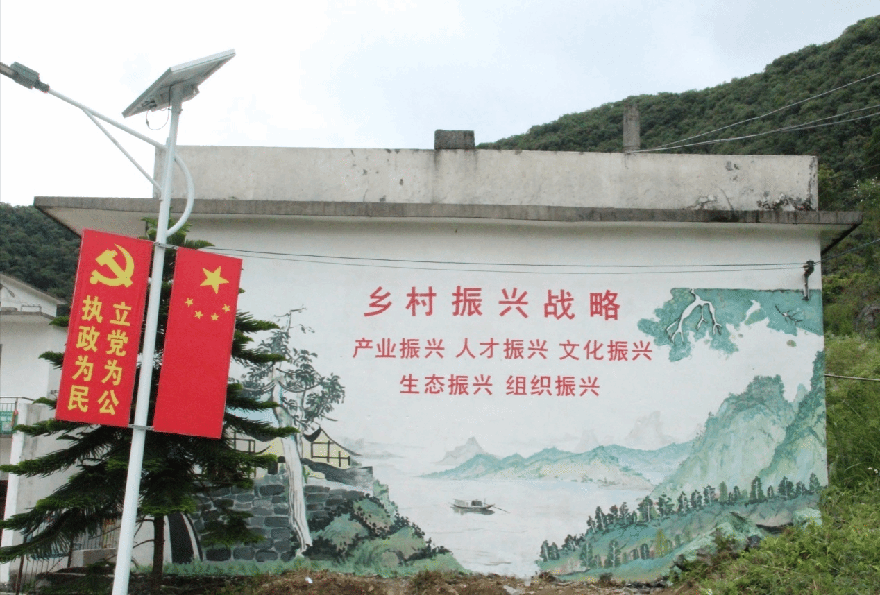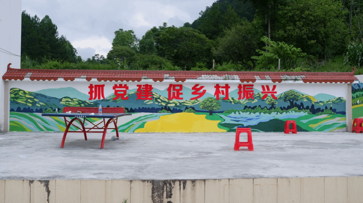 “绘美乡村”实践团为河池市南丹县六寨社区党群服务中心绘制的《强党建引领,建美丽乡村》主题墙画(二)