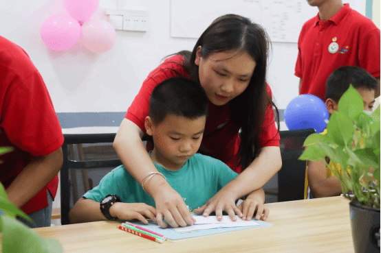 观察团成员在兴趣课堂上细心辅导小朋友