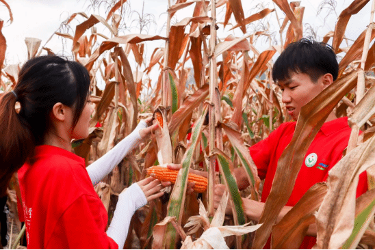 观察团成员到田地里帮助村民摘玉米