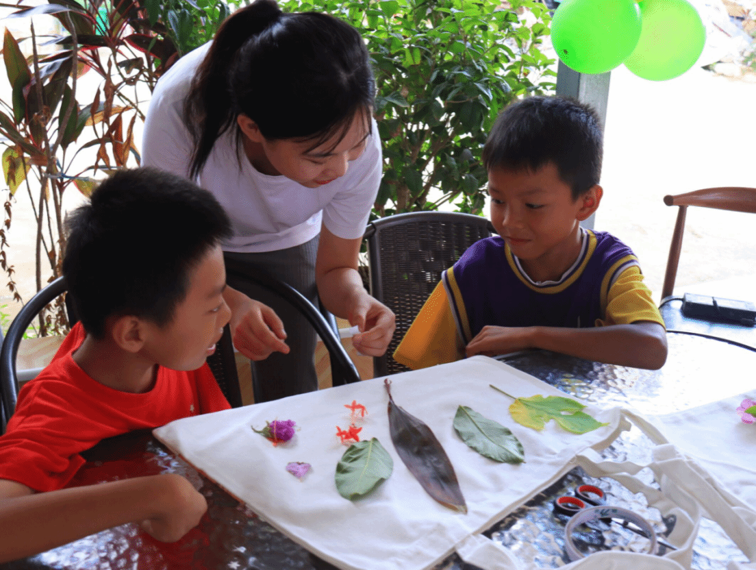 实践团成员与三江坡儿童一起做环保手工