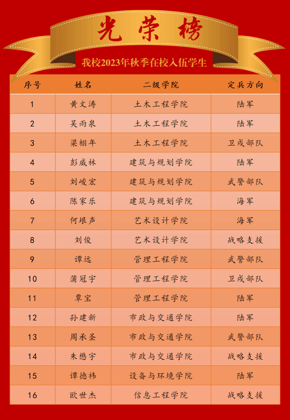 经过体格检查、政治考核、身体复查、役前教育训练等环节层层考核、严格选拔,最终乐鱼全球最大体育平台_乐鱼(中国)共有16名在校应征学生被批准光荣入伍,成为中国人民解放军的一员。