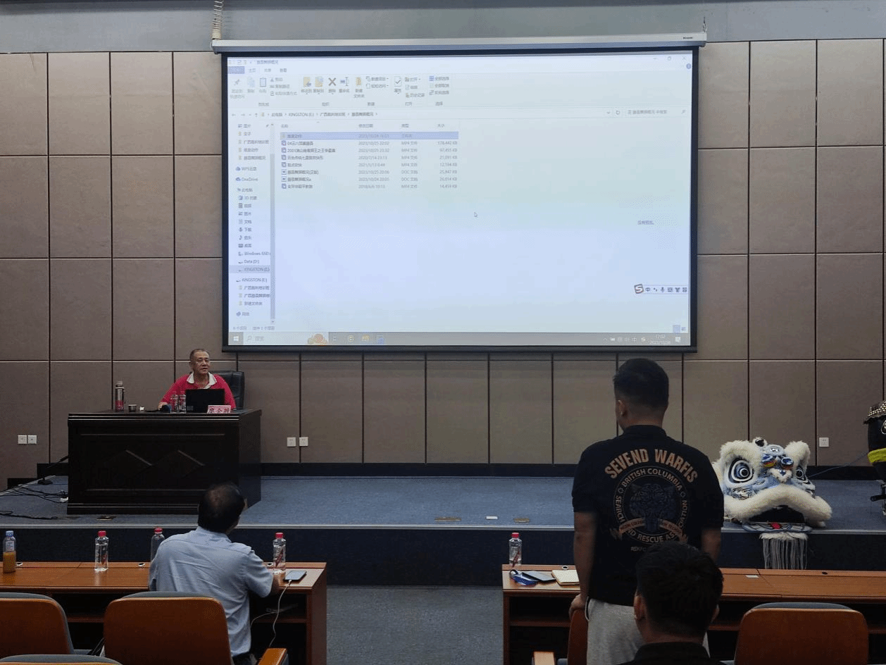 讲座中,潘慧斌主席详细讲解了广西龙狮运动发展的历程和传统文化进校园的意义,让同学们了解此次讲座的意义,同时也激发了同学们学习龙狮文化的热情。廖金胜副主席用生动诙谐的语言,从广西龙狮技艺的变革、舞狮道具、着装及种类等方面对龙狮文化进行了详细讲解。