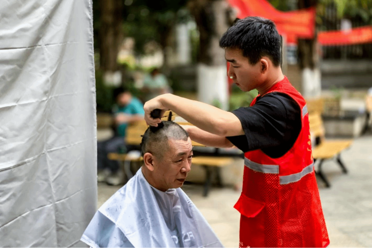 学生志愿者为社区居民提供公益理发服务