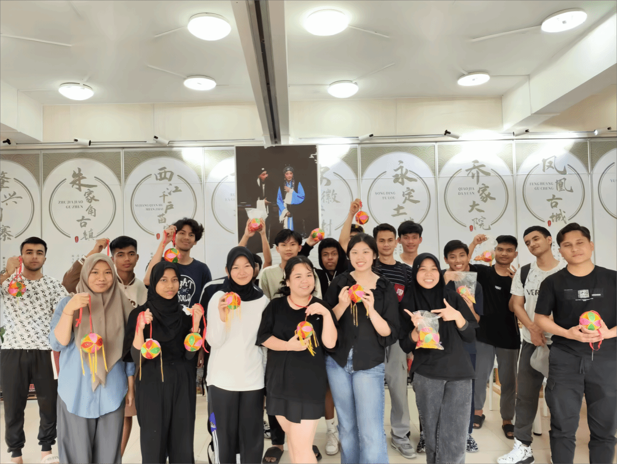 活动开始,梁金来老师带领留学生参观了学生社区非遗工作坊,并对部分非遗项目作了简要介绍,重点介绍了具有广西风情的非物质文化遗产——靖西绣球来历、文化内涵、传统寓意、制作工艺和文化价值等老师的带领下大家制作绣球,沉浸式感受中国传统文化的魅力