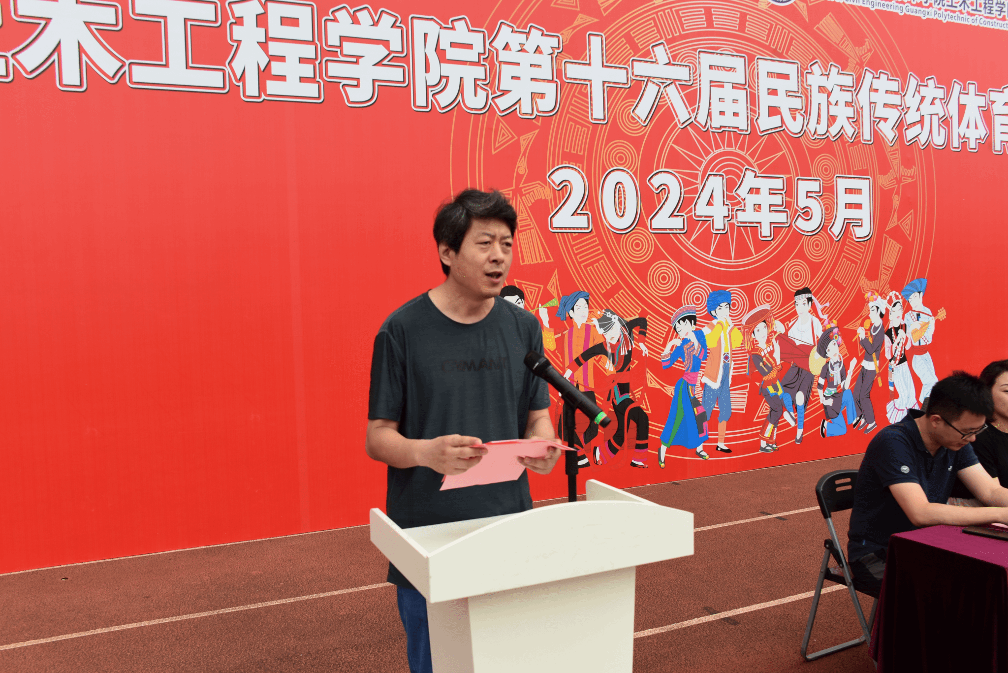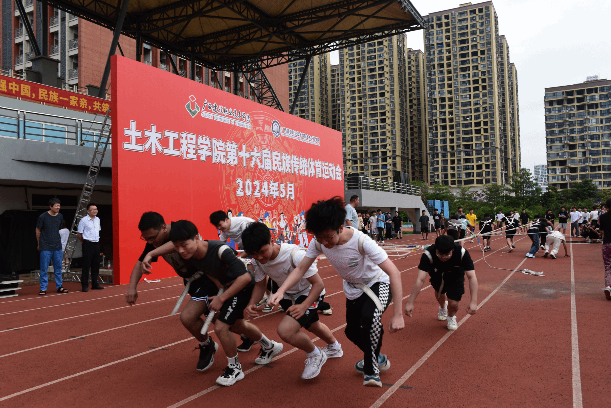 广西建院5月29日讯(土木工程学院 文/石明成 图/王海昕 黄健 韦景朝)为弘扬中华民族优秀传统文化,全面促进学生身心健康5月28日下午,土木工程学院在学校田径场举办第十六届民族传统体育运动会开幕式。土木工程学院党总支书记孔祥刚院长李朝阳副院长葛春雷罗献燕等学院领导出席,全体辅导员、班主任代表以及全体在校学生参加开幕式。