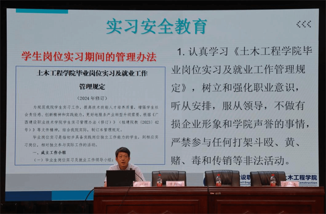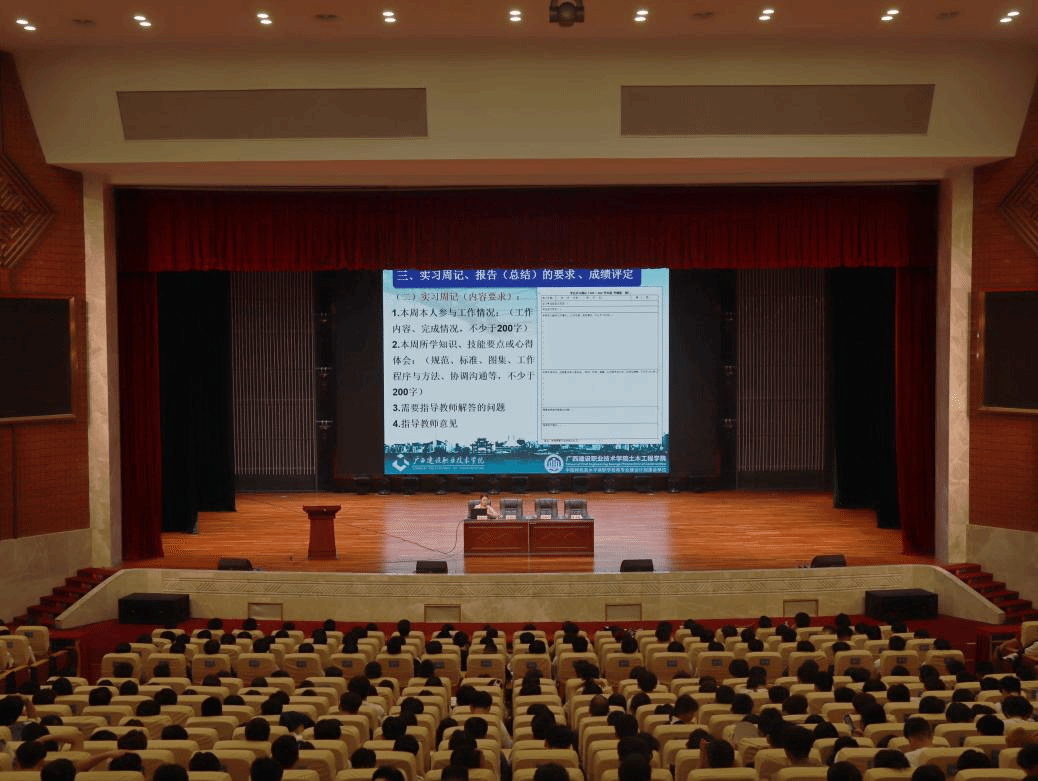 广西建院7月10日讯(土木工程学院讯 文/石明成 图/韦景朝 何可人)为进一步加强毕业岗位实习过程管理和安全教育,明确岗位实习要求,7月9日,土木工程学院在学校礼堂分批次召开2025届毕业生岗位实习动员及安全教育大会。土木工程学院院长李朝阳,党总支书记孔祥刚,副院长葛春雷、罗献燕等学院领导出席,实习老师代表、2025届毕业生辅导员及毕业生参加大会。大会由吴国堃老师主持。