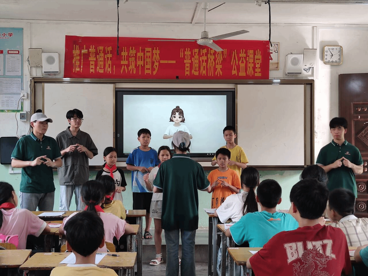 在“普通话桥梁”公益课堂中,实践团以“推广普通话 弘扬爱国情”为内容主线,开展普通话知识讲解、文化知识竞赛、绕口令、红色经典诗歌朗诵、歌曲表演、猜字谜等一系列丰富多彩的语言文字趣味活动,为小学生们带来了一次别开生面的普通话知识推广盛宴。孩子们积极参与,课堂气氛活跃,生动有趣,进一步帮助小学生们增强说好普通话的意识,提高语言文字实际应用能力。