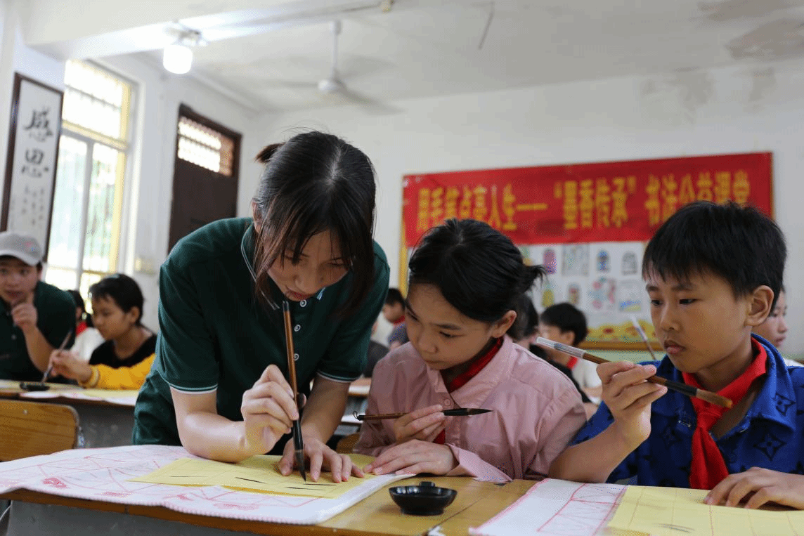 在举行“墨香传承”软笔书法公益课堂时,实践团成员首先给小学生传授书法基础知识,让他们了解汉字的基本结构和章法。随后分组手把手地现场教授孩子们基本笔画和写作技巧,在书法练习中让小学生们感受书法艺术的魅力,明白写好规范字的重要性,弘扬中华优秀传统文化,增强文化自信。古山小学蓝华校长表示:“由于师资力量薄弱,学校几乎没有开展过推普的相关活动,甚至书法课程学校也没有正式开设过。特别感谢实践团给孩子们带来的精彩课程。”听到蓝校长的点评,让实践团的成员深刻感受到乡村孩子们更加需要文化的帮扶,也更加明确了今后推普工作的努力方向。