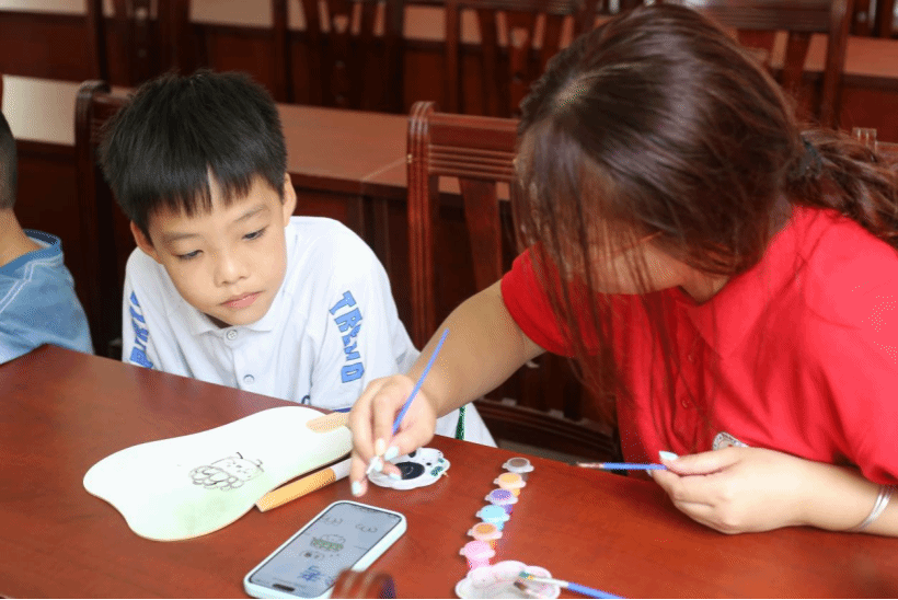 实践团指导儿童在扇面上绘画植物