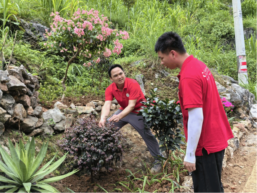 拓荒清理、平整场地;他山之石,搬运砌筑;就地取材、移植栽种;清扫场地、养护浇水,每个环节都扎实有序,严谨认真。伴随着炎炎夏日,尽管团队成员每天都是挥汗如雨、无暇休息,但依然热情高涨,充满活力。“看着边角地一点点变化变美,感觉再苦再累都值得”实践团袁同学说。“苗木栽植不能过浅,会影响营养吸收,再向下挖一公分”“四季茶花要注意浇水量和施肥量,三角梅要注意修剪”……绿化美化施工现场,随处可见实践团指导老师、“广西技术能手”、风景园林高级工程师陈品瑞躬身垂范、耐心讲解。