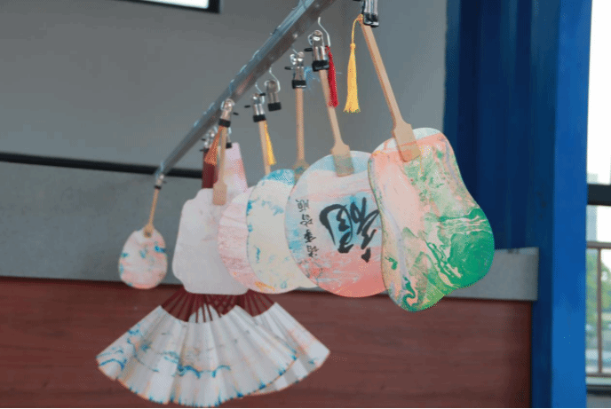 国漆流动,体验非遗漆扇之美。漆扇Diy同样吸引了大家的目光。同学们认真聆听老师讲解漆染的历史发展与漆扇的制作技巧,拿出提前准备的小团扇、折扇、大漆颜料等物品,根据自己的喜好选择颜料,将扇面放入被颜料渲染好的漆桶中,以点、甩、弹、划等手法,在水面绘出图案效果,再晕染在团扇表面,形成妙趣横生、浑然天成的漆色纹理。现场欢声笑语,无不惊叹于每一个成品的独一无二。