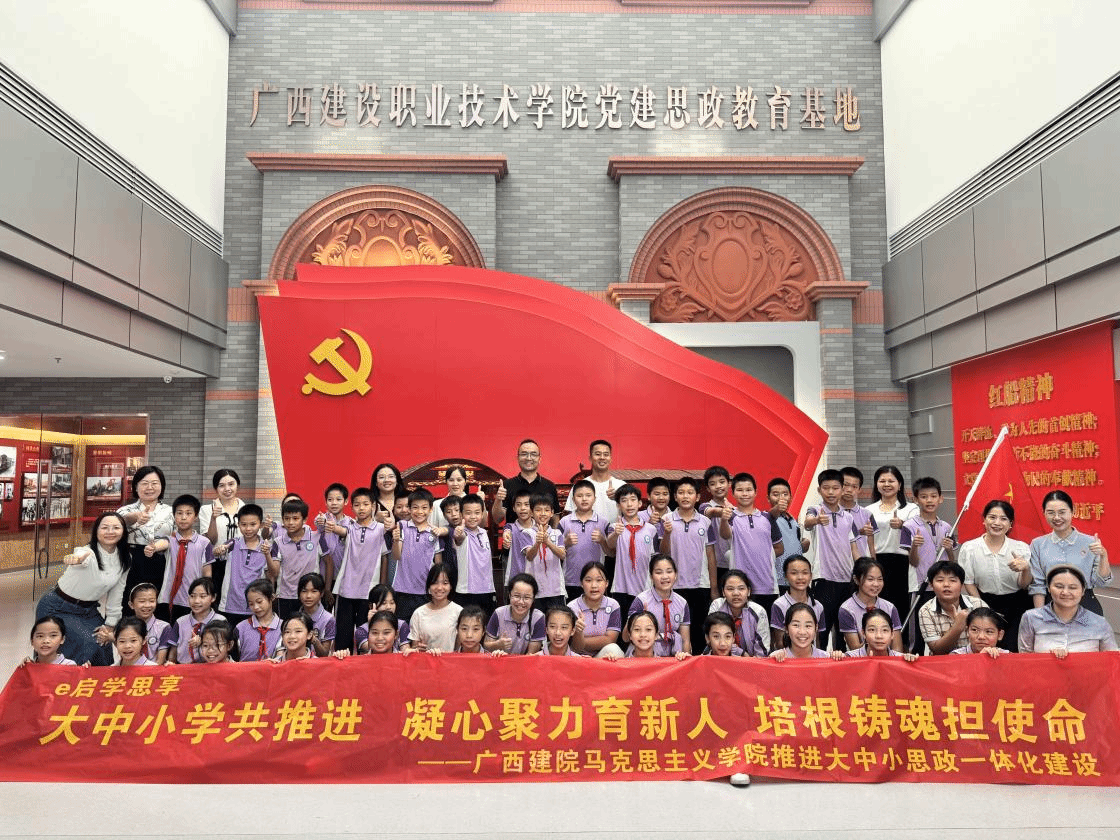 广西建院1121日讯马克思主义学院 /范峥 /毕莉近日,马克思主义学院携手南宁市西庄路小学在学校党建思政教育基地开展了“共筑红色育人同心圆,构建大中小学思政课一体化建设新格局”为主题的红色研学活动,部分思政课教师、400余名五六年级学生共同见证了这场精彩纷呈的思想盛宴。